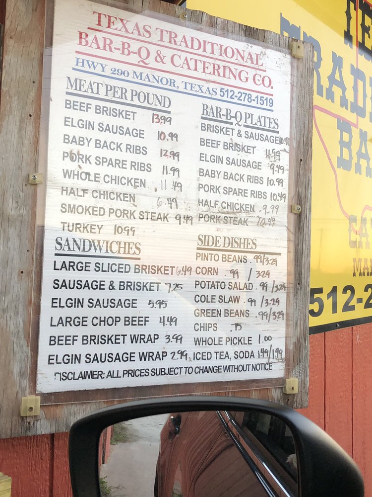 Introducing the menu at Texas Traditional Bar-B-Q, a rustic and charming spot in Manor, TX, offering a variety of barbeque options. Customers praise the generous portions and delicious meats, such as the beef brisket and Elgin sausage, both priced at $15.99 per pound. The BBQ plates are a popular choice, allowing you to pair brisket or sausage with sides like coleslaw or mac and cheese for $11.99. Reviews highlight the juicy brisket, flavorful Elgin sausage, and the homemade sauce that complements the dishes perfectly. With options for takeout, delivery, and catering, as well as a friendly and attentive service, Texas Traditional Bar-B-Q is a must-visit for BBQ lovers looking for quality food at affordable prices.